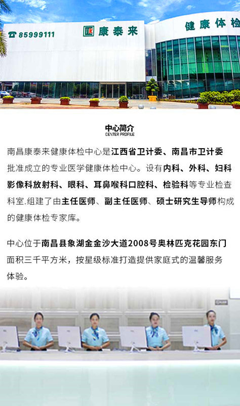 康泰来健康有“礼” 598元抢2000元体检套餐 三选一(男女均适用) 自用送礼两相宜 有健康才有将来 康泰来特意推出了 598元抢2000元 三选一套餐(男女均适用) 我们一起去看看吧! 套餐1 套餐2 套餐3 怎么样,内容还够丰富吧! 不单种类丰富 而且价格还相当便宜~ 现在抢购只要598元 三选一(男女均适用) 限时抢购 598元抢购康泰来体检套餐 (三选一,男女均适用) 抢购日期:即日起至售罄为止 使用日期:2019.6.18-2019.12.31 预约方式:提前1天电话预约 预约电话:0791-85999111 发码日期:购买后立收含电子码短消息 套餐包含:598抢2000元体检套餐(3选1,男女均适用) 门店地址:南昌县象湖金沙大道2008号奥林匹克花园东门(新力都荟对面) 营业时间:8:00--16:30 温馨提示: 1.体检前一天需清淡饮食,休息好,体检当天早晨须空腹 2.早餐在10:30前供应 3.采血截止时间为09:30之前 4.3天之后出电子报告,7天出纸质报告 5.电子报告可以自行在网址查询,纸质报告需客人到体检的相应门店领取 6.营业时间周二至周日8:00至16:30(节假日除外),法定节假日休息不体检 7.交通线路:25路、37路、248路、526路、707路乘车到奥林匹克花园站下即可 康泰来 休息区 贵宾区 男宾区 女宾区 餐厅 内部环境 中心面积3000平方米,优雅舒适的环境 以星级的标准为您提供 家庭式的温馨服务体验 特别声明 1.预约日期不到不作为退款理由 2.本产品只限本人或转赠亲友使用,禁止二次售卖,如发现有人在任何渠道进行二次售卖,商家有权取消其使用资格,并不予退款! 3.本产品凭短信电子码到店使用,购买成功后不设退款,过期不用则自动作废! 4.图片仅供参考,具体情况以实物为准 5.购买此套票视为认同此声明及活动规则 活动规则 先抢购·收电子码·电话预约·可转赠朋友 ◆购买 购买成功后不设退款 2019年12月31日前 未使用则自动作废 ◆接收电子码短信 即买即发码(注意短信拦截) 产品核销方式如下: 电话预约 请提前致电商家预约使用 ◆ 可转赠 此套票电子码在未核销前 仅限本人或可转赠亲友使用 康泰来 南昌康泰来体检中心是江西省卫计委、南昌市卫计委批准成立的专业医学健康体检,设有内科、外科、影像科、放射科、眼科、耳鼻喉科、口腔科、检验科等专业检查科室,组建了由主任医师、副主任医师、硕士研究生导师构成的健康体检专家库。